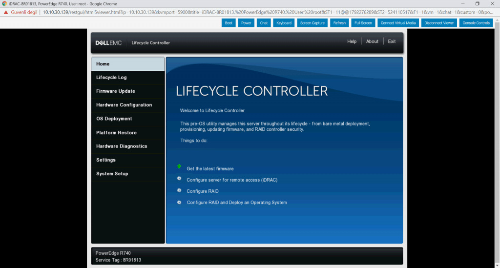 Power On diyerek sistemi açıyorum. Cihaz açılırken F10 tuşu ile “Lifecycle Controller” açıyorum.