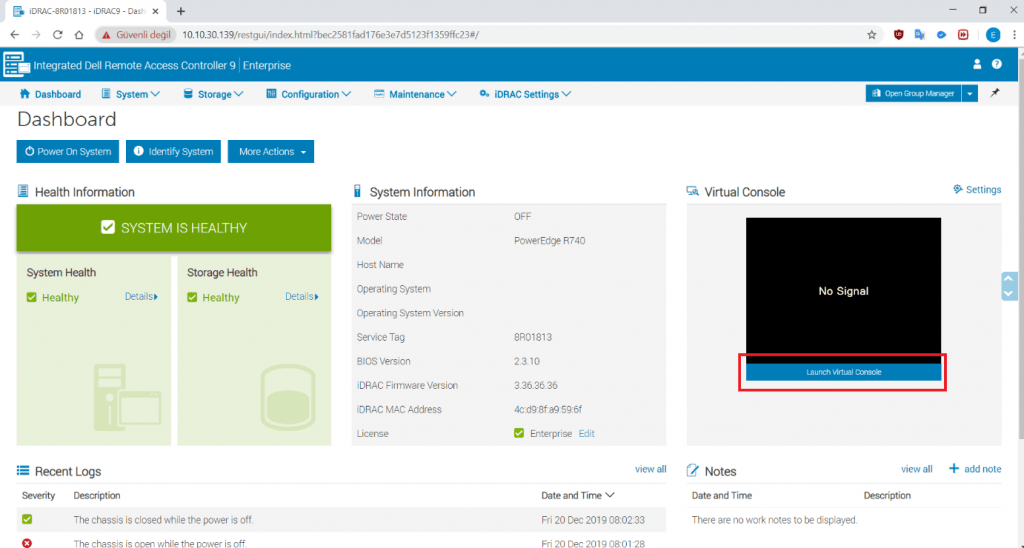 Dashboard Karşımızdadır. Sağ tarafta bulunan “Virtual Console” bölümünün hemen altında “Launch Virtual Console” diyerek pencereyi açıyorum.