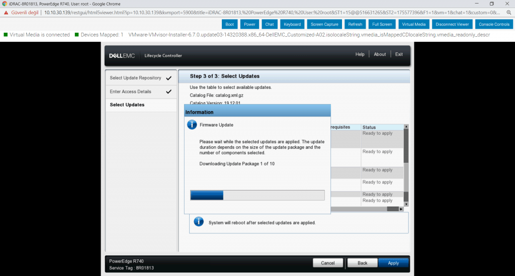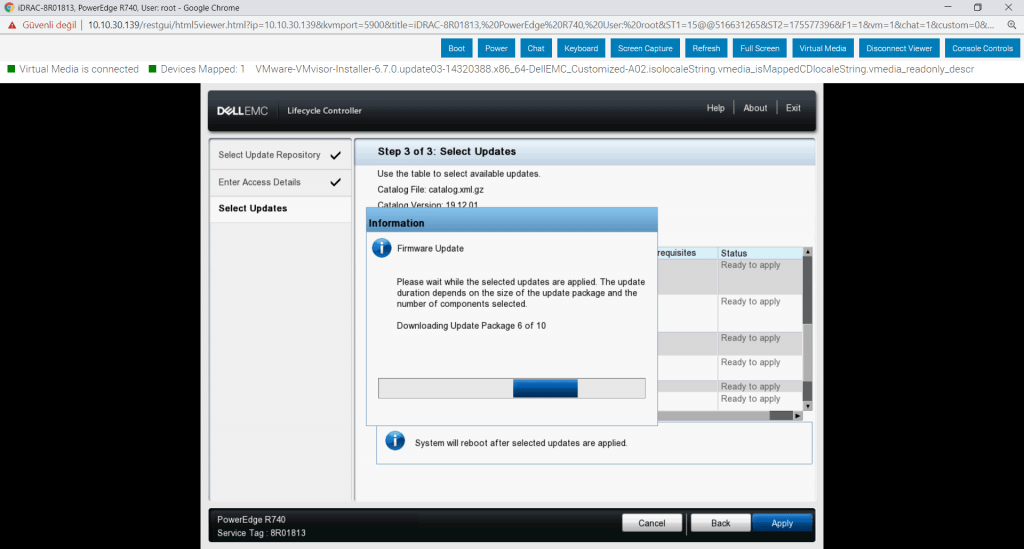 Dell Update Sunucularına bağlantı kurduk, ilgili driver ya da yazılım güncellemelerini seçip “Apply” diyorum ve yüklemenin tamamlanmasını bekliyorum. İşlemler tamamlanınca sunucu kendiliğinden yeniden başlayacaktır.