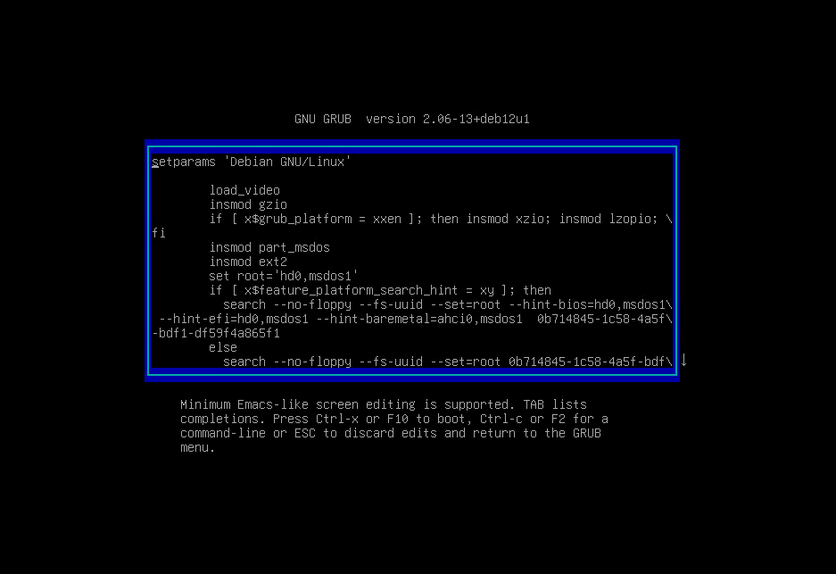 Sunucuyu restart ediyoruz ve GRUB menüsü ekranı açıldığında “e” tuşuna basıp editörü açıyoruz.