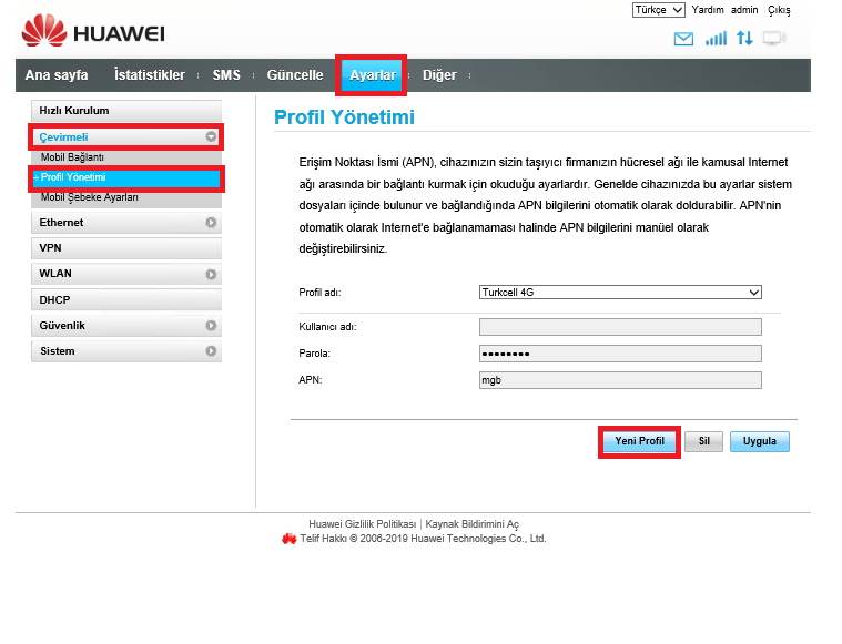 Kullanıcı adı ve şifremizi yazdıktan sonra açılan ekranda Ayarlar Sekmesi açılır sırasıyla Çevirmeli – Profil yönetimi ve Yeni Profil açılır.