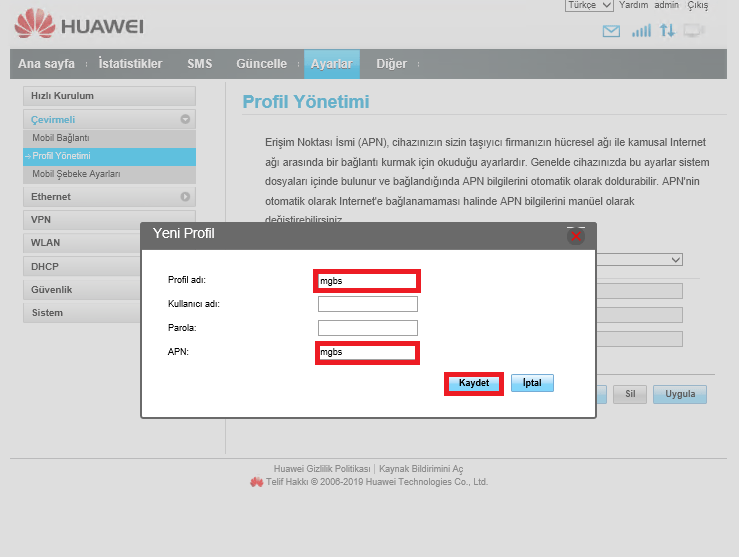 Açılan pencerede Profil Adı : mgbs olacak, Kullanıcı adı ve Parola boş olacak ve APN: mgbs olarak çekilde dolduruyor ve ardından Kaydediyoruz.