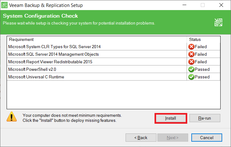 Bu bölümde Veeam Backup & Replication kurulumu için istenen yazılımsal gereksinimlerde eksiklikler olduğunu belirtmektedir. Bu eksiklikleri gidermek için “Install” diyorum.