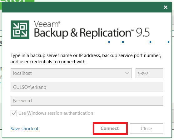 Masaüstünde bulunan Veeam Backup & Replication Kısayolunu çalıştırıyor ve “Connect” butonuyla yazılımı açıyorum.