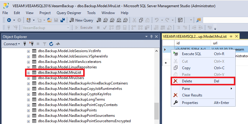“Databases -> VeeamBackup -> Tables -> dbo.Backup.Model.MruList” tablosunu “Edit Top 200 Rows” diyerek açıyoruz. ve Karşımıza gelen ekranda aşağıdaki gibi ağ paylaşımı görülen satırı siliyoruz.
