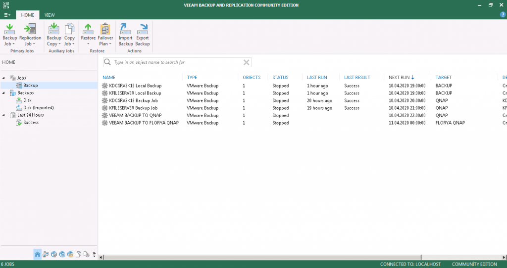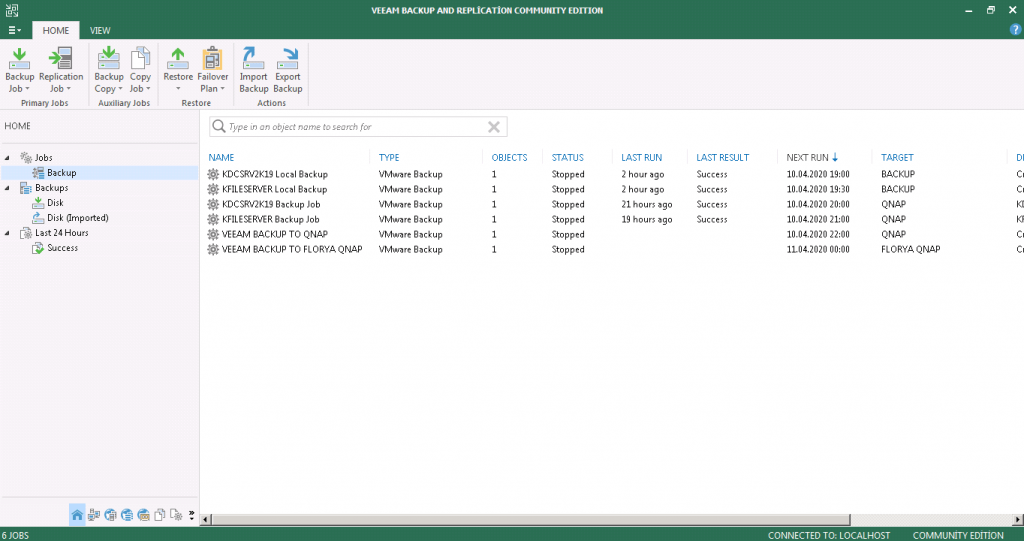 Eski Veeam Backup & Replication sunucuma bağlanıp arayüze giriş sağlıyorum. Daha önce oluşturduğum Yedekleme Kurallarım görünmektedir.