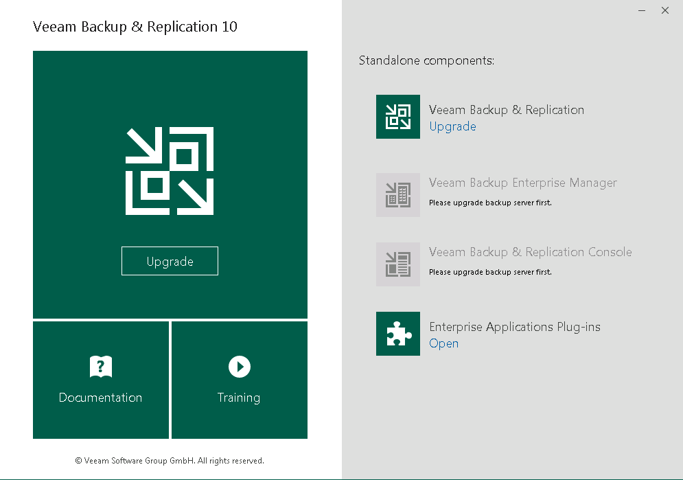 Veeam Backup & Replication 10 versiyonunu indirdikten sonra uygulamayı çalışıtırıyor ve Upgrade diyerek işlemlerime başlıyorum.