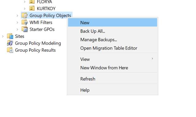 Bunu yapabilmemiz için öncelik olarak GPO Management Console açıyorum ve Yeni bir Group Policy oluşturuyorum.