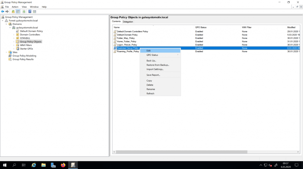 Oluşturduğum Group Policy’i Edit diyerek açıyorum.