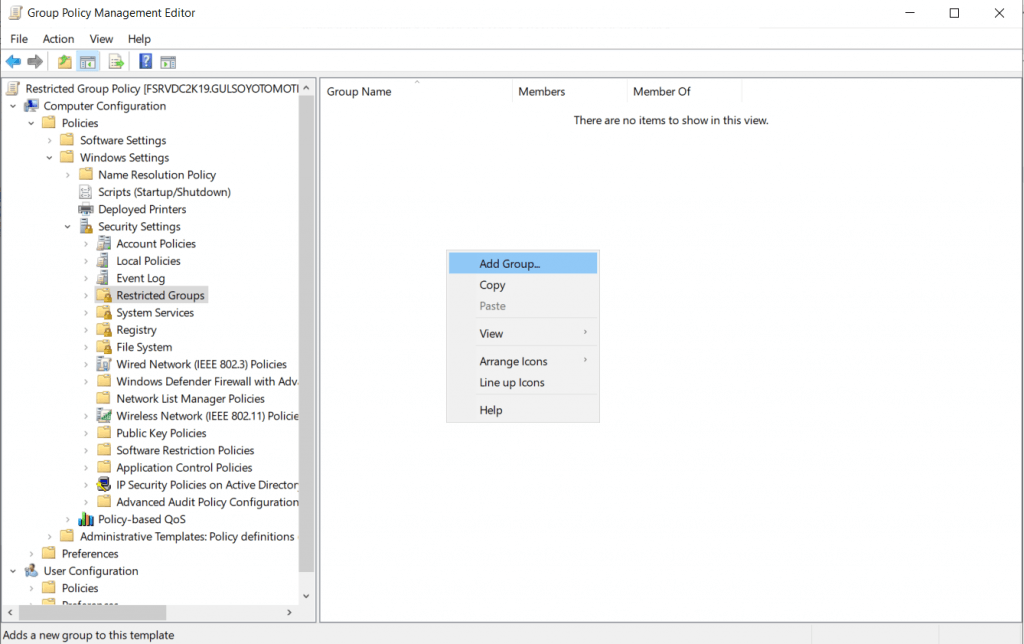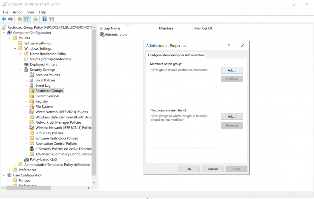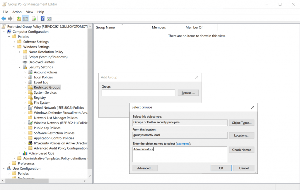 Computer Configuration-Policies-Windows Settings-Security Settings-Restricted Groups bölümüne gelip “Add Group” diyorum.