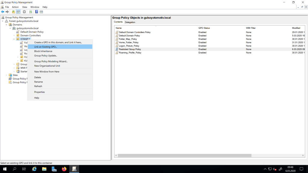 Ekleme işlemleri tamamlandıktan sonra GPO yu uygulamak istediğimiz OU üzerine gelip “Link an Existing GPO” diyerek aktif ediyorum.