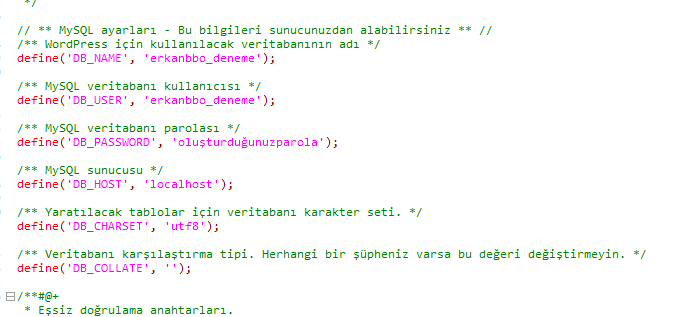 Oluşturduğumuz veritabanı, veritabanı kullanıcısı ve parolası ile birlikte ilgili yerlere girişini yapıyoruz ve wp-config.php şeklinde kaydediyoruz.