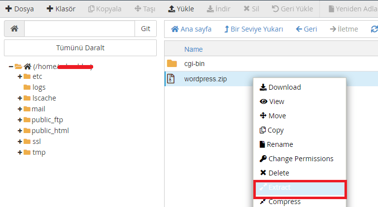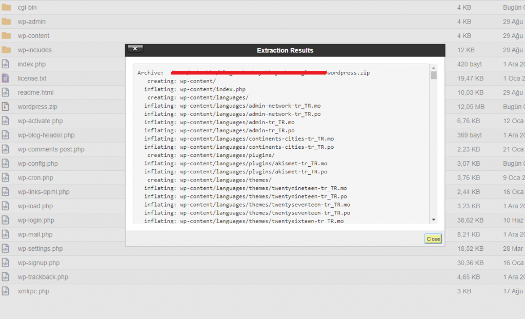 “Yükle” butonuyla wordpress.zip dosyamı seçiyor ve ilgili dizine yüklüyor ve dosyaları çıkartıyorum.