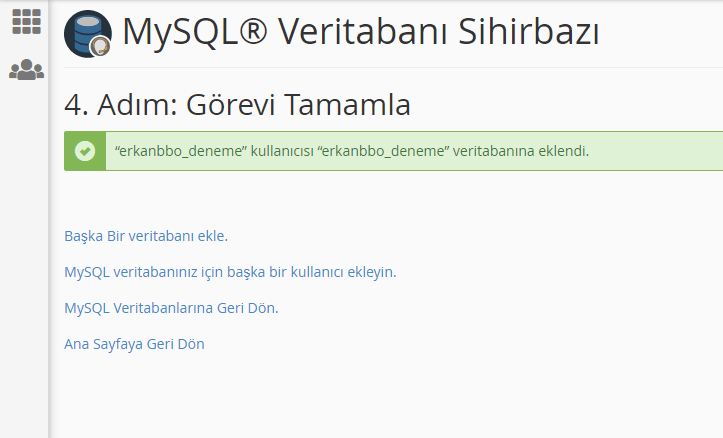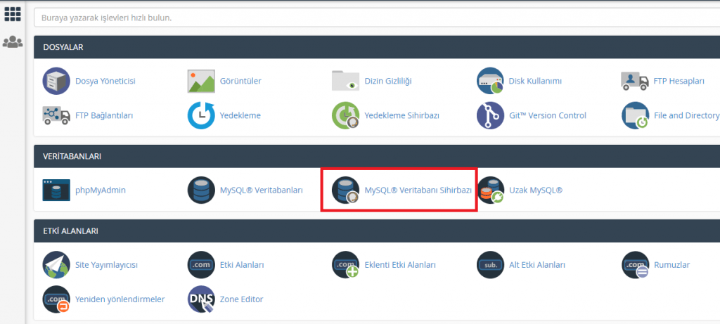 Giriş yaptıktan sonra panelimiz açılıyor. Öncelik olarak MySQL Hesabı oluşturmamız gerekiyor. Bunun için Panel içerisindeki “MySQL Veri Tabanı Sihirbazı” nı açıyorum.