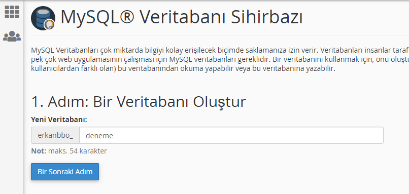 “Deneme” adında veri tabanı oluşturuyorum ve Bir sonraki adıma geçiyorum.