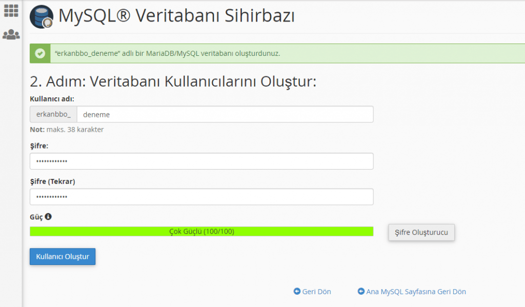 Gelen ekranda “deneme” adında bir kullanıcı ve şifre oluşturuyorum. Oluşturduğumuz şifre birazdan bize lazım olacak