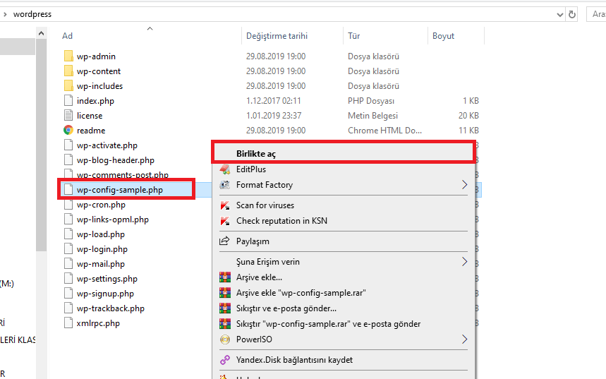 İndirmiş olduğumuz wordpress dosyalarını bir klasöre çıkartıyoruz ve sonrasında wp-config-sample.php dosyasını not defteri ile düzenliyoruz.